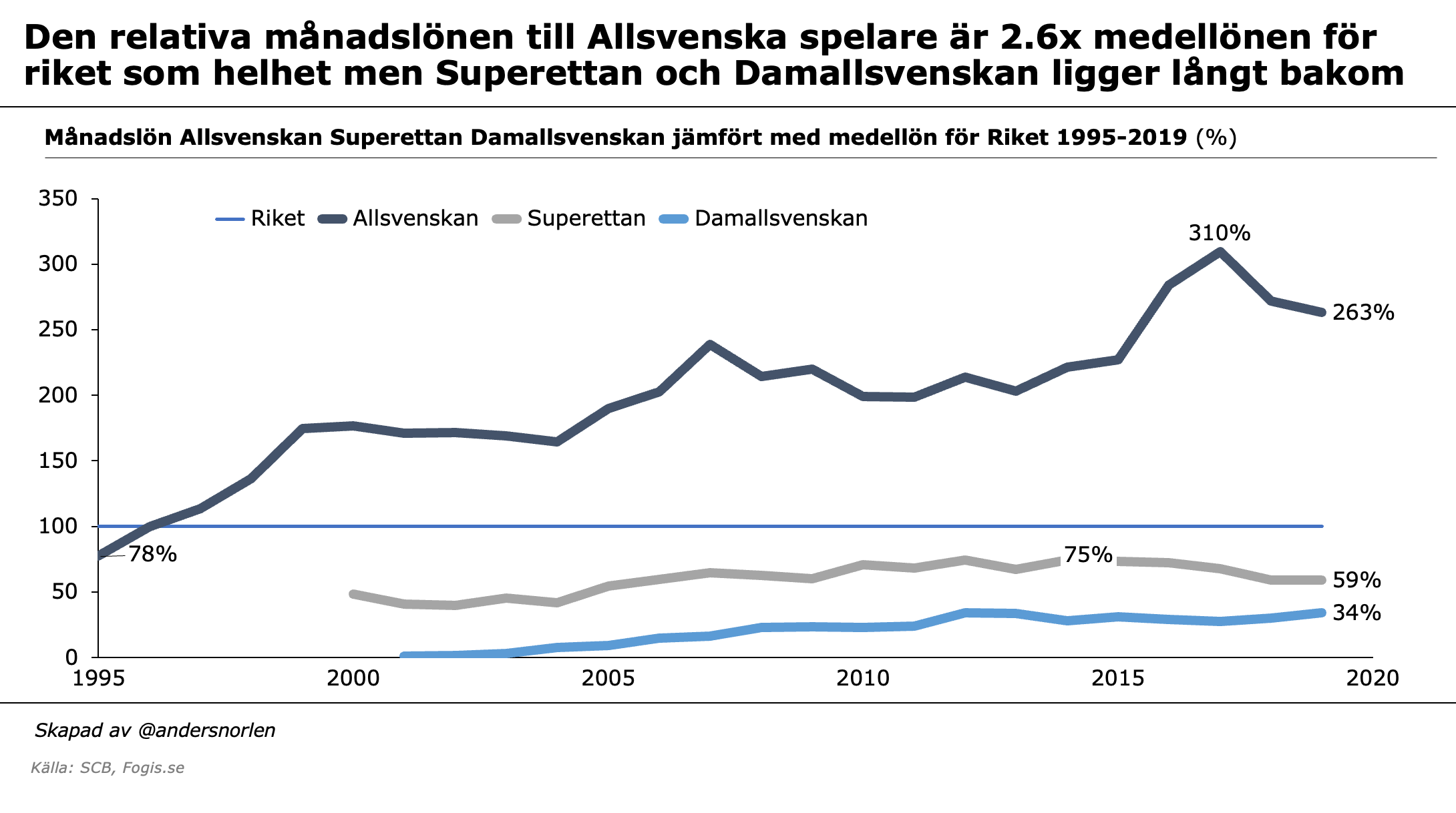 Om vi även tar och kikar på detta i relativa termer – genomsnittslönen per liga jämfört med genomsnittslönen för Riket som helhet per år – så ser vi kanske ännu tydligare vad som hänt under de senaste 20 åren.