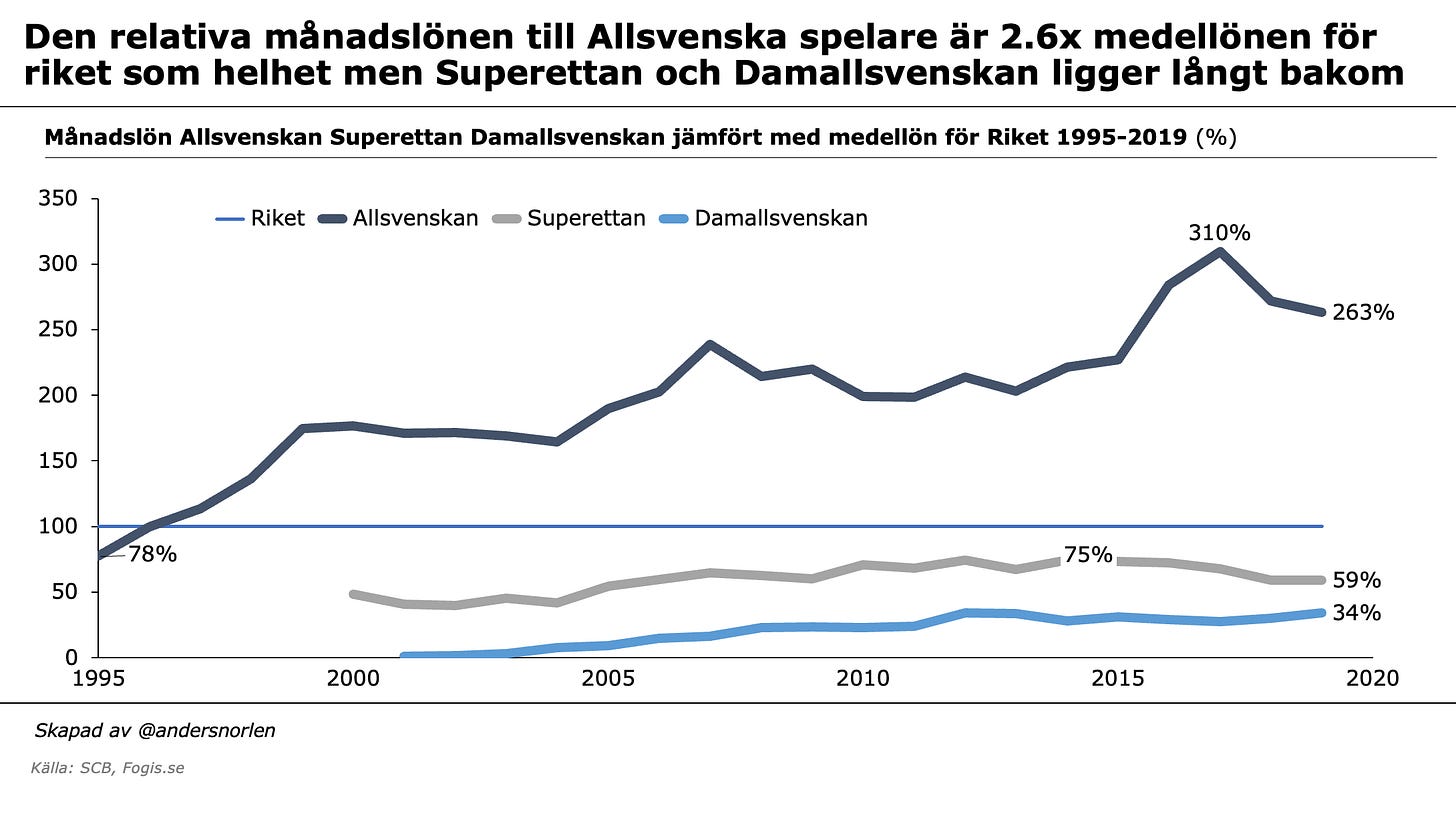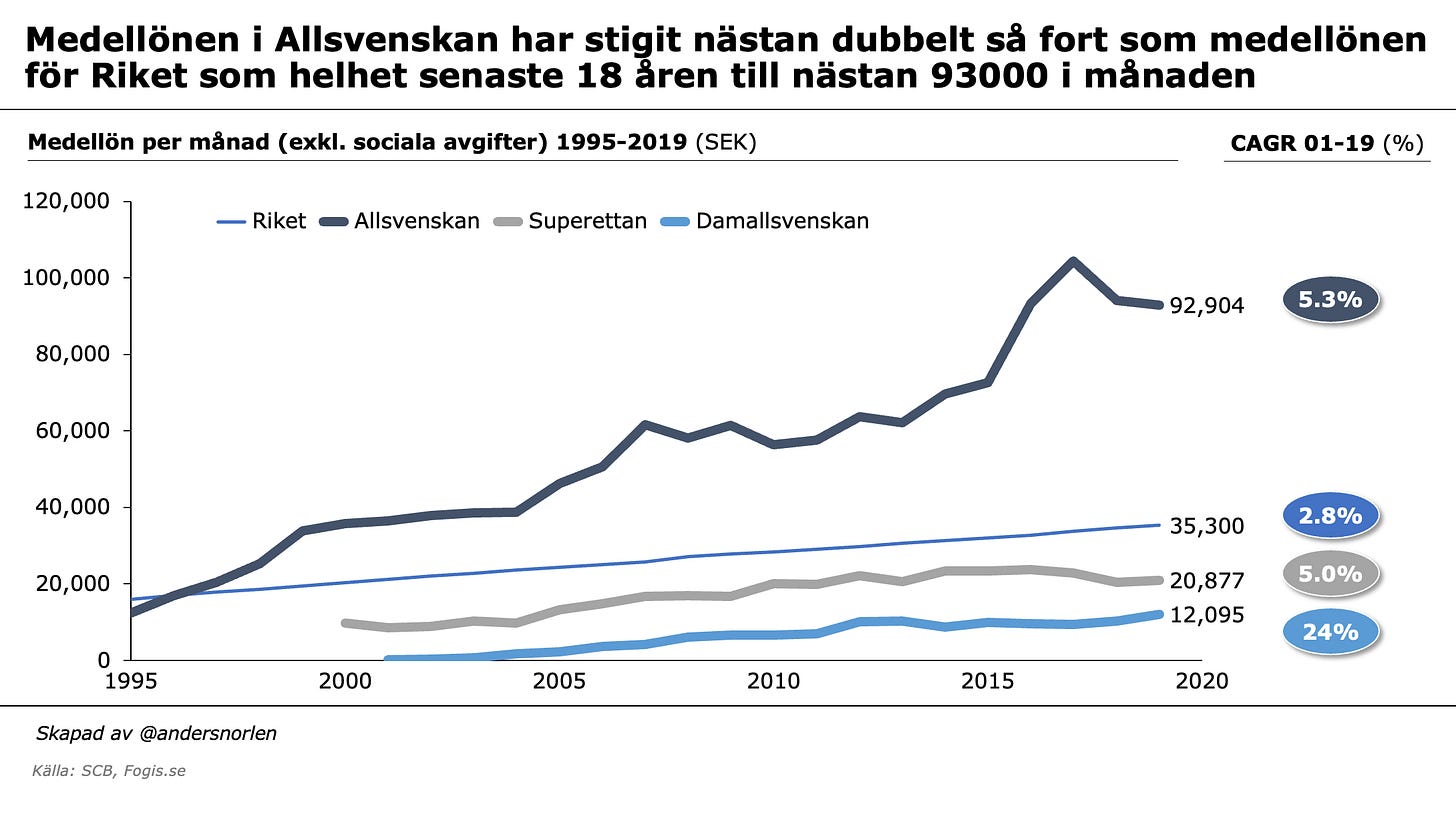Under de senaste 18 åren har de mellan 330-390 unga män som spelar fotboll i Allsvenskan fått se sina lönekuvert öka med i genomsnitt 5.3% per år, vilket kan jämföras med genomsnittssvensken som sett löneökningar under samma tid på 2.8% per år.