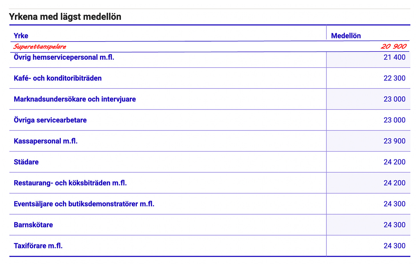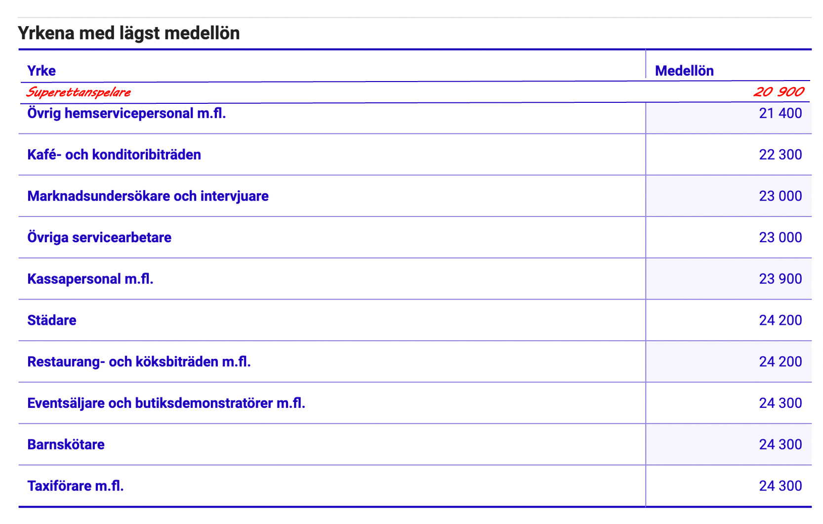 Den genomsnittliga månadslönen i Superettan 2019 låg på knappt 21,000 kronor i månaden före skatt – lägre än den kategori yrkesverksamma – Övrig hemservicepersonal – som hade den lägsta månadslönen i SCBs statistik för 2019.